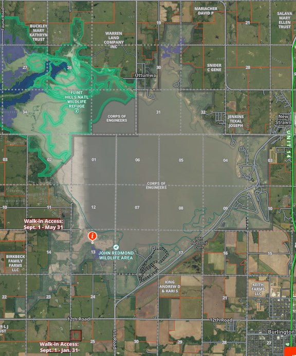 John Redmond Wildlife Area is bordered on the west by the Fish & Wildlife Service's Flint Hills Wildlife Area and on the southeast by Corps of Engineers property. That adjacent Flint Hills NWR adds another 18,500 acres of wetlands, ponds, shallow marshes, and farmlands nearby — though regulations differ between agencies so you'd need to know which land you're on. Combined, it's a massive chunk of public hunting ground in eastern Kansas where public land is hard to come by.